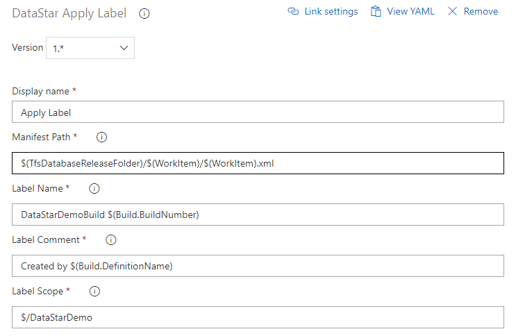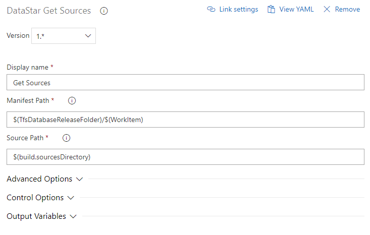 Add the DataStar Get Sources task. Set Manifest Path to the location of the deployment manifest using the $(WorkItem) variable, and Source Path to $(build.sourcesDirectory).