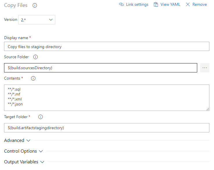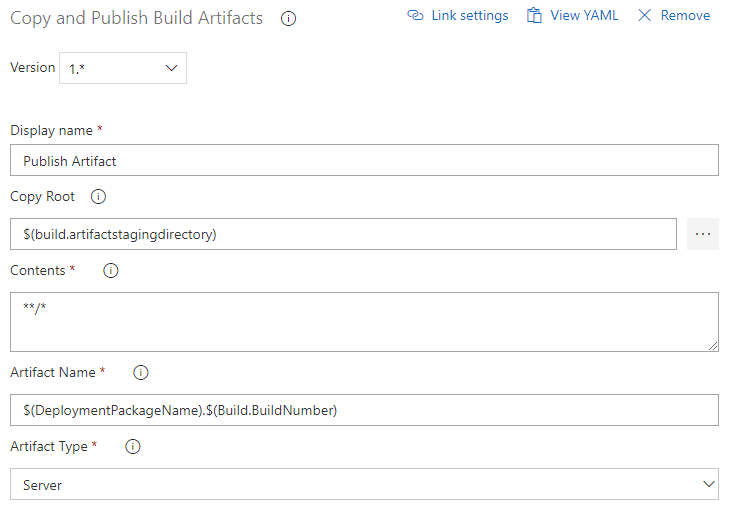 Publish the staged files as an artefact. The example publishes to Azure Pipelines; a file share or a NuGet feed works equally well. The release pipeline takes this artefact as input.