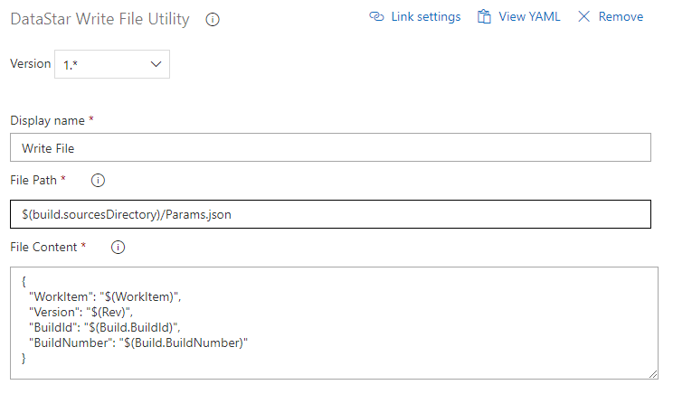 Add the Write File task to produce a JSON file with build metadata (work item, version, build number). The release pipeline reads this file to recover the variables for deployment.