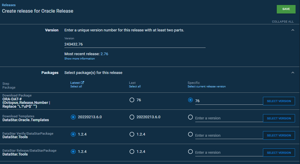 Creating an Octopus release when a DataStar project uses dynamic package selection takes a little care. The release has multiple packages (the scripts, DataStar.Tools, templates), and the dynamically-named one needs its version set separately from the release version.