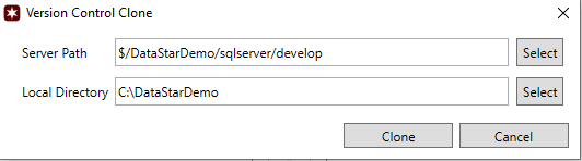 The clone option allows you to clone an existing repository to set up a local workspace folder. This requires you to select the sever path and a local directory. The server path should be a valid DataStar repository and the local directory must be an empty folder.